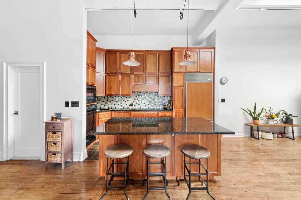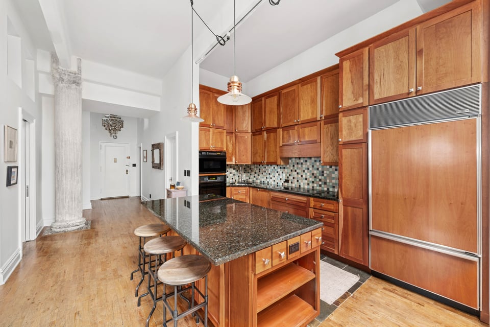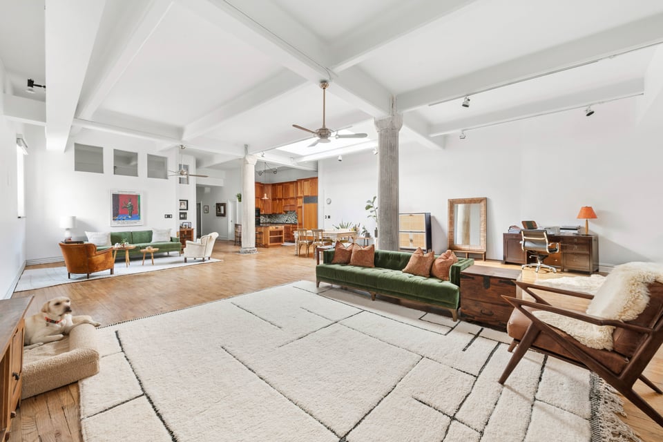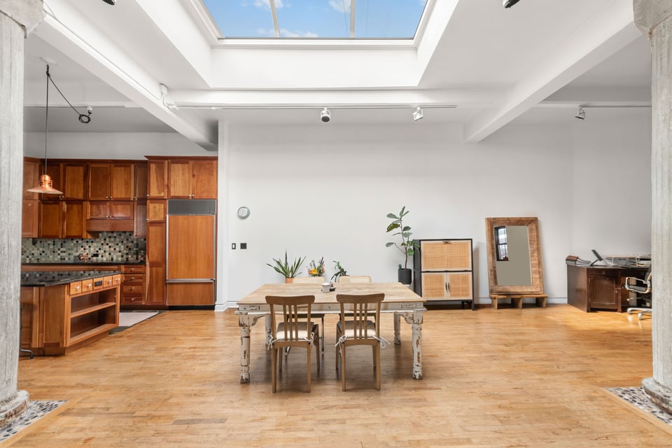 Spanning approximately 1,825 square feet, LOFT 7E delivers extraordinary proportions defined by soaring 12-foot ceilings, original exposed beams, striking concrete columns, and a dramatic oversized skylight with retractable shades that floods the home with beautiful natural light throughout the day.