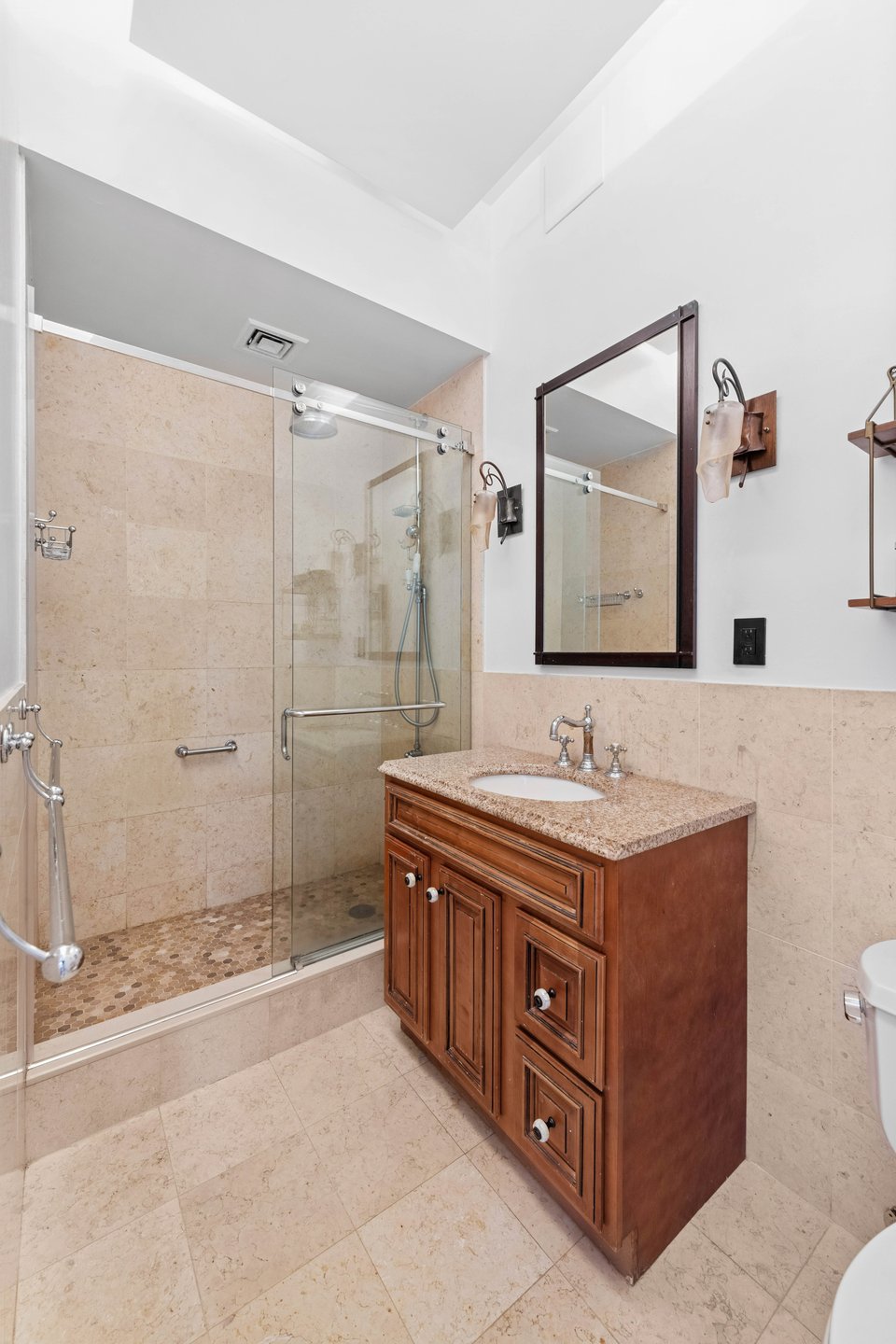 The beautifully finished bathroom features a sleek standing shower enhanced by a built-in heat lamp, adding warmth and comfort during cooler seasons.